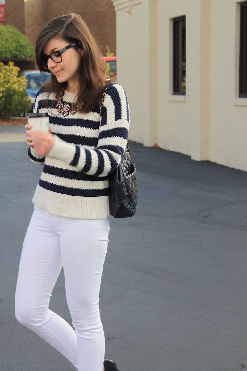 Every year, I always talk about how no white after Labor Day is a dumb rule that we should actively ignore. And I normally do ignore it, especially while it's still hot and then I occasionally mix some cream into my winter wardrobe. But I normally don't make a statement quite this bold. When I put on this sweater the other day, the thought of putting on black pants or dark jeans made me shutter. It feels like that is all I wear these days and I really wanted to mix it up. Then, I saw my white pants sticking out of my drawer and it was one of those why not moments. Worst that can happen is I don't like so I take them off. But instead, I loved them. The white against white was so bold and gave my outfit the perfect statement I had been looking for. It was freezing too, so I warmed up with one of my favorite winter drinks...hot chocolate. That is the start to a perfect morning- a yummy drink and an outfit coming together!